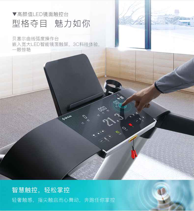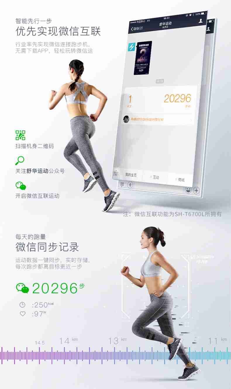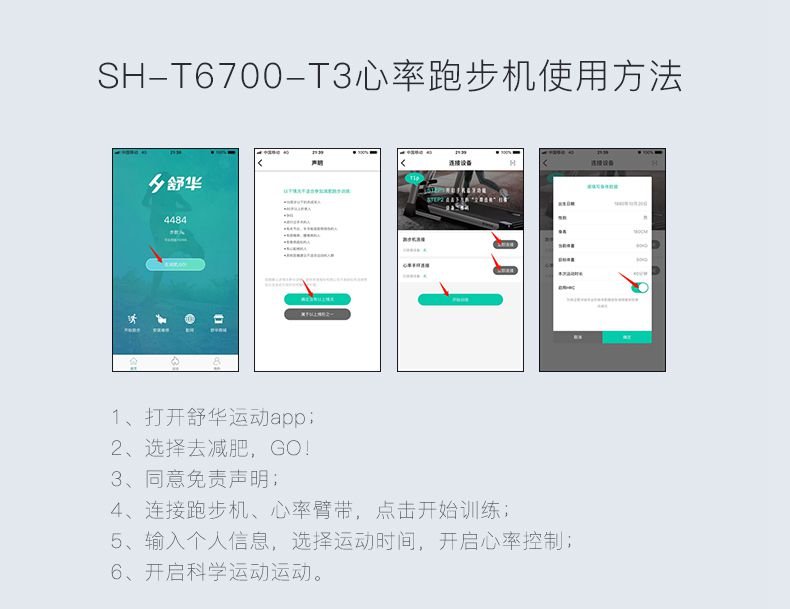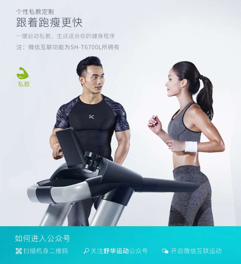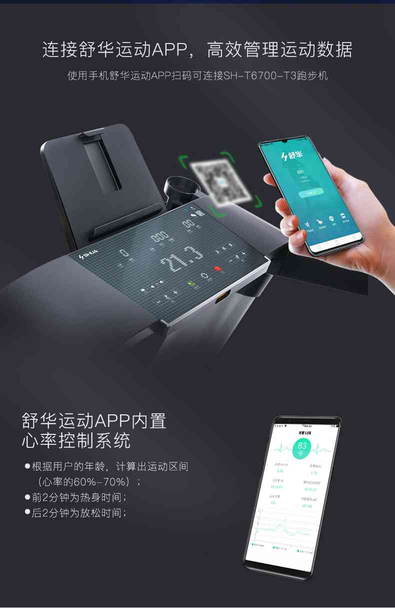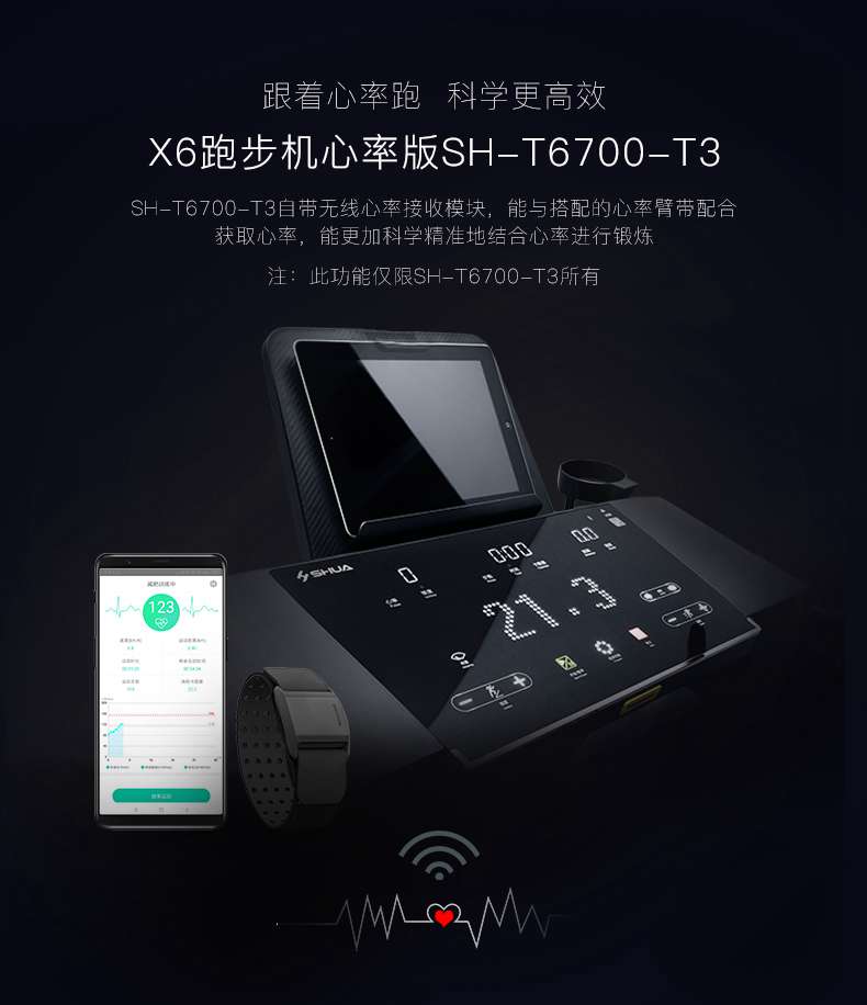 SH-T6700-T3跑步机为了帮助用户进行更加科学有效的运动,搭载球王会APP连接心率臂带实现心率控制,通过监测运动心率从而实现科学运动。