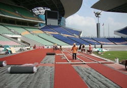 2、安装便捷,只需使用我们配套提供的专用粘接剂,在少量人力和机械条件下,即可将跑道卷材铺贴在密实的基础上,安装完全跑道在24小时后即可投入正常的使用。