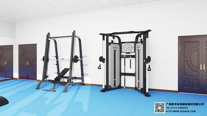 5.球王会史密斯机SH-G6853*1台-锻炼股四头肌、股二头肌、肱三头肌;史密斯机采用固定轨迹的杠铃设计,大大降低了训练过程中的安全风险,通过深蹲、卧推、肩推等经典动作,可以针对性地锻炼腿部力量、上肢力量、背部肌群、胸部塑形以及肩部稳定等,从而全面提升身体素质,满足不同的健身需求;